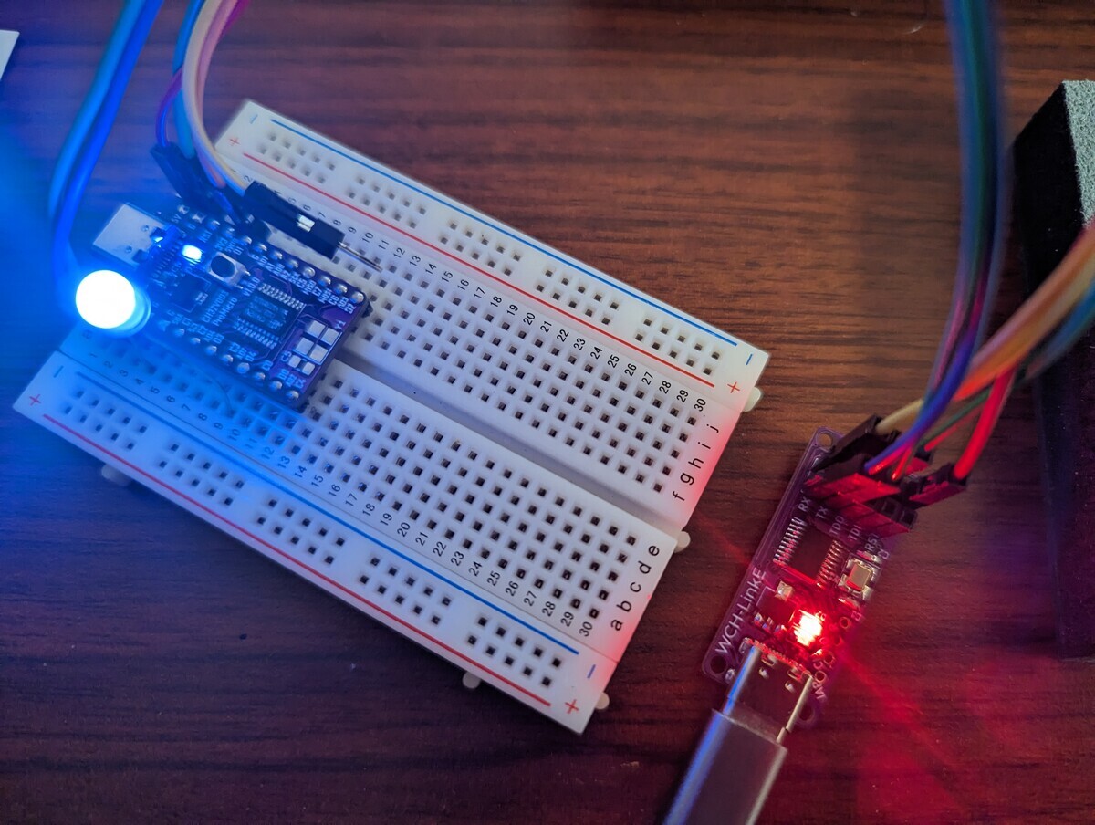 一方私は WCH-LinkE のソースコードは公開されていませんが、回路図とファームウェアバイナリは公開されているので、それを使って公式のWCH-LinkEと同じ CH32V305 を使って、WCH-LinkEクローンを作りました。Lチカの写真右側にあるのがそれです。これについてはまた記事にしようと思います。